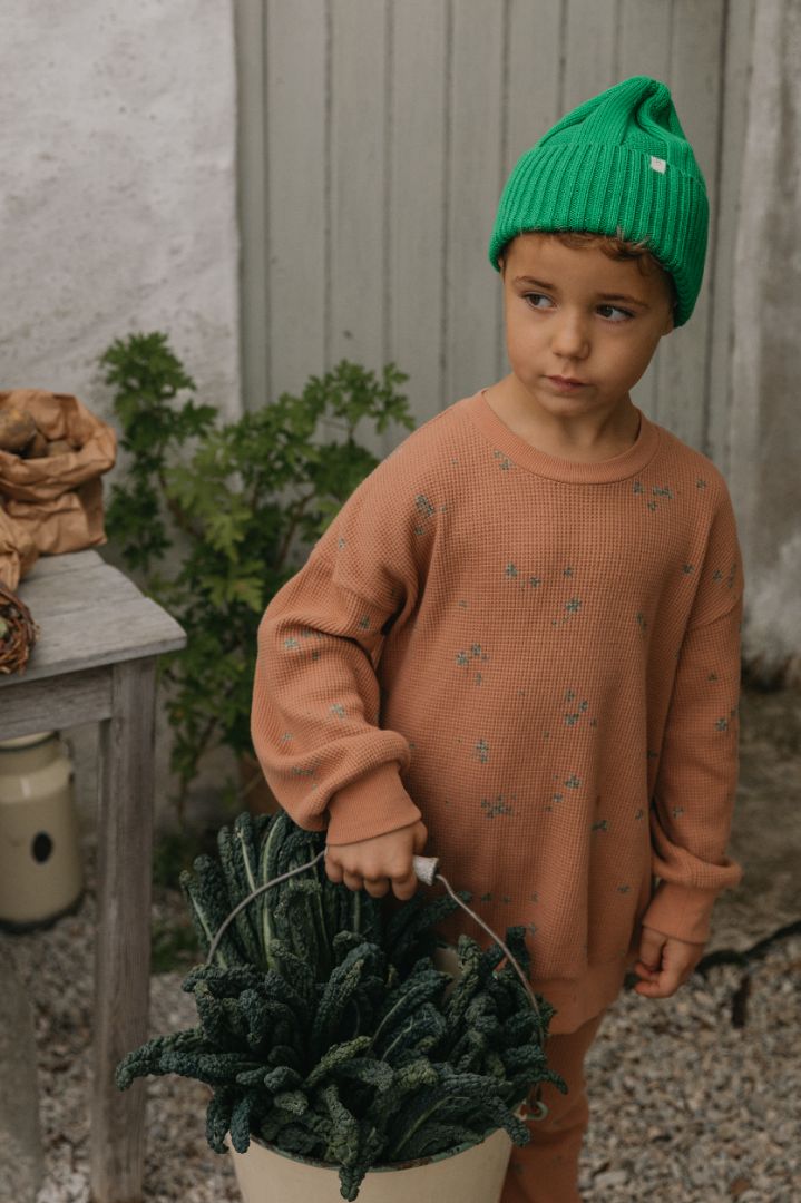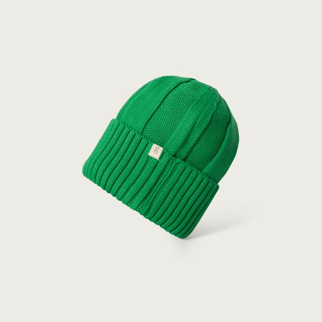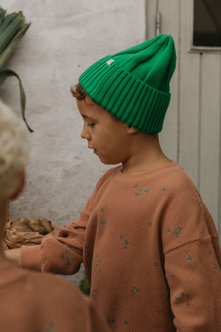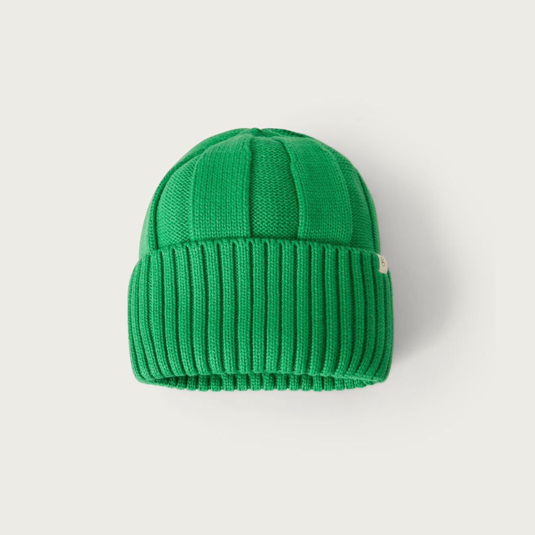 Knitted beanie with fold-up in soft ribbed cotton quality. A lovely pop of colour for the spring!