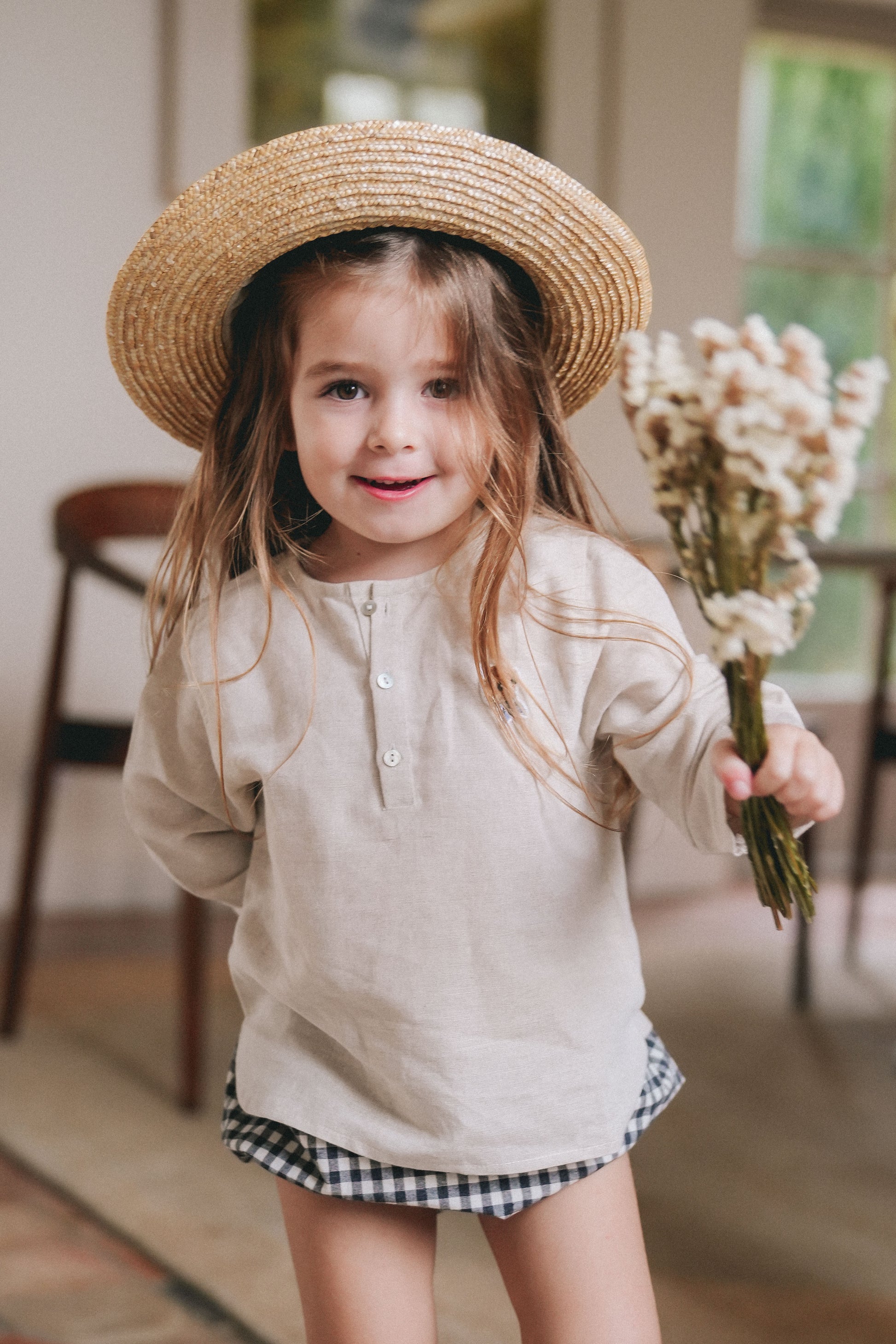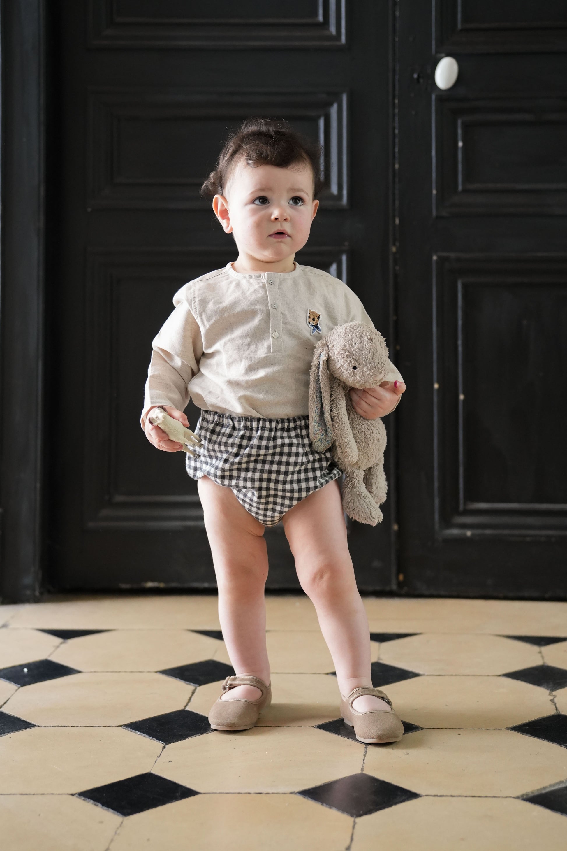 Alice is a very soft cotton bloomer, perfectly suited to little girls and little boys, made with love in a lovely vichy cotton. The soft elastics on the thighs and waist guarantee a perfect fit and optimal comfort throughout baby's day. To create an adorably matching ensemble, we suggest pairing it with our charming Thais shirt.