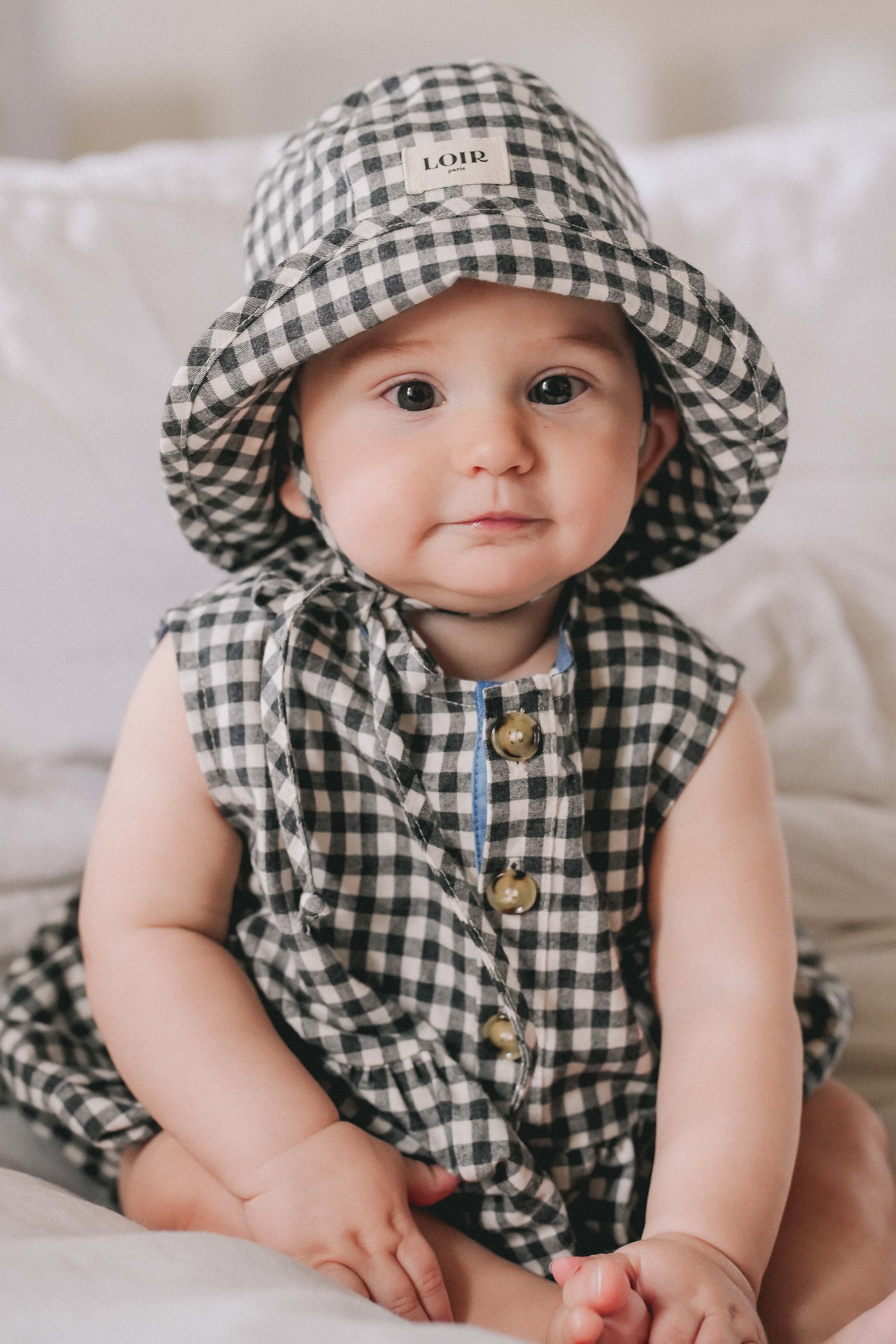 TOSCANE is a gingham cotton sun hat that ties under the chin, lined and flexible, ideal for protecting the heads of babies and younger children. Pair it with Pio romper to create an adorable matchy-matchy ensemble.