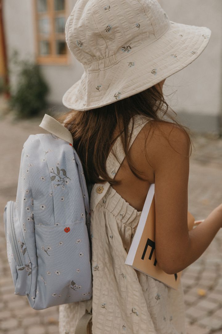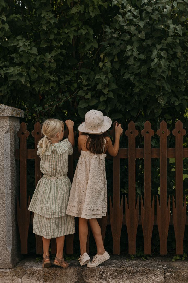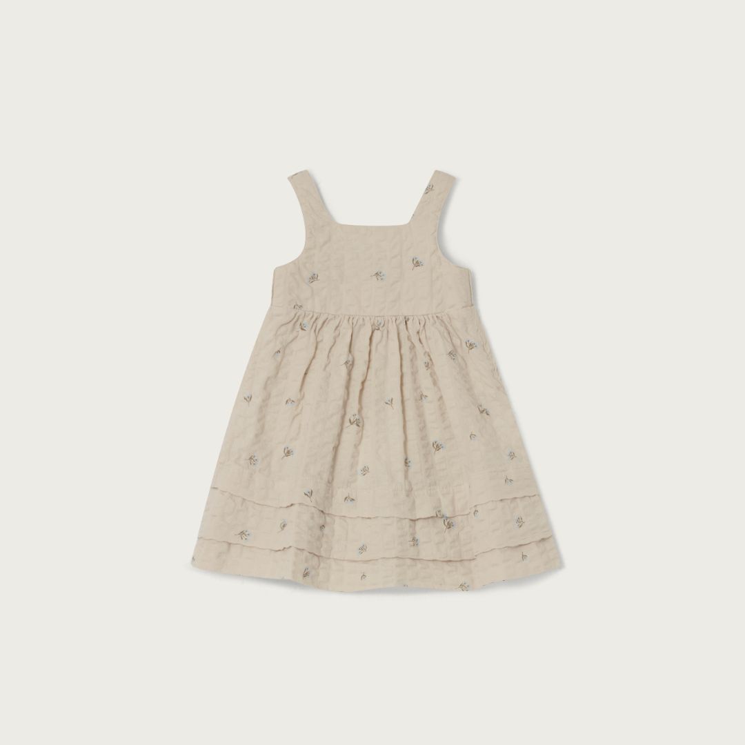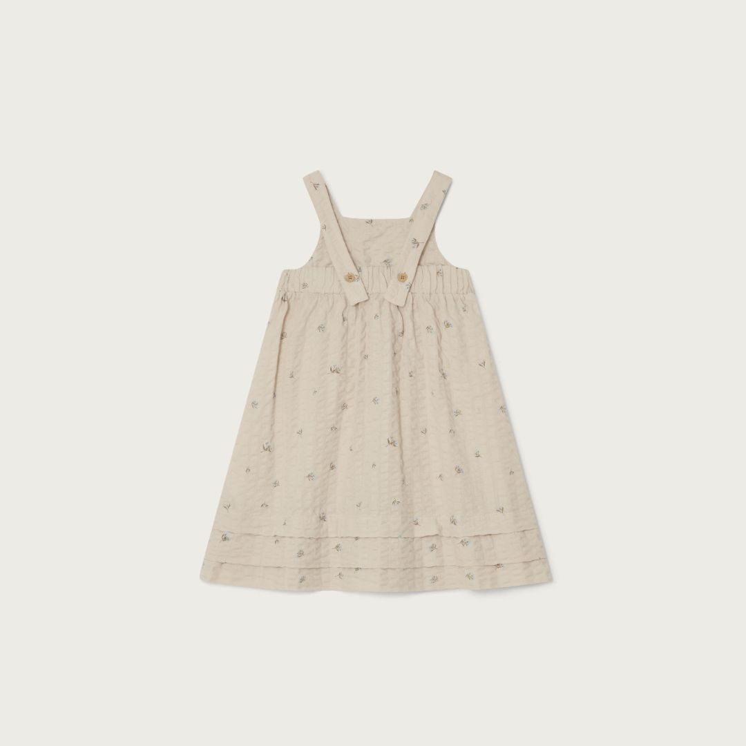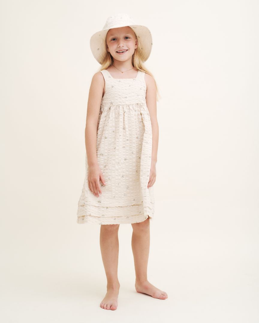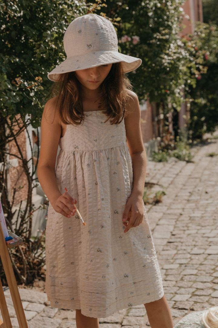 Sleeveless dress in a light cotton seersucker quality with adjustable shoulder straps and elastic at back. The dress has a square neckline, a slightly flared double-layered skirt and a cut-off waist with ruching that creates a beautiful drape.